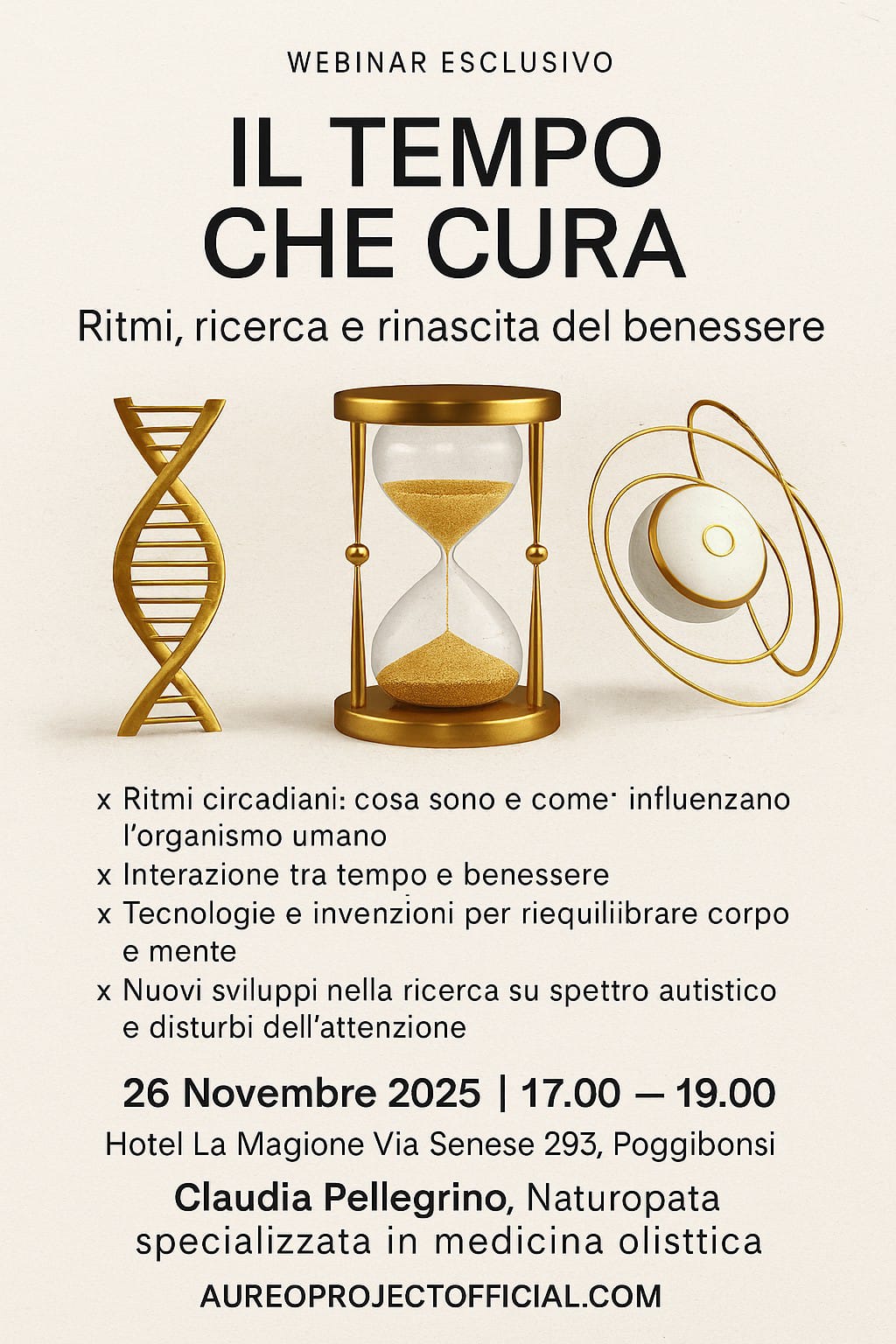 Webinar Esclusivo – Poggibonsi, 26 Novembre 2025 'Il Tempo che Cura: Ritmi Circadiani, Ricerca e Rinascita del Benessere' Scienza, medicina olistica e innovazione si incontrano per esplorare il potere terapeutico del tempo. Il 26 novembre 2025, dalle ore 17.00 alle 19.00, presso l’Hotel La Magione (Via Senese 293, Poggibonsi), si terrà il webinar “Il Tempo che Cura”, un evento unico dedicato al rapporto tra tempo, salute e consapevolezza. A guidare l’incontro sarà la Naturopata Claudia Pellegrino, specializzata in medicina olistica, nota per le sue conferenze e ricerche pionieristiche sul tema. Durante il webinar verranno presentati i risultati di una ricerca innovativa e un’invenzione esclusiva pensata per riequilibrare corpo e mente attraverso la sincronizzazione de ...